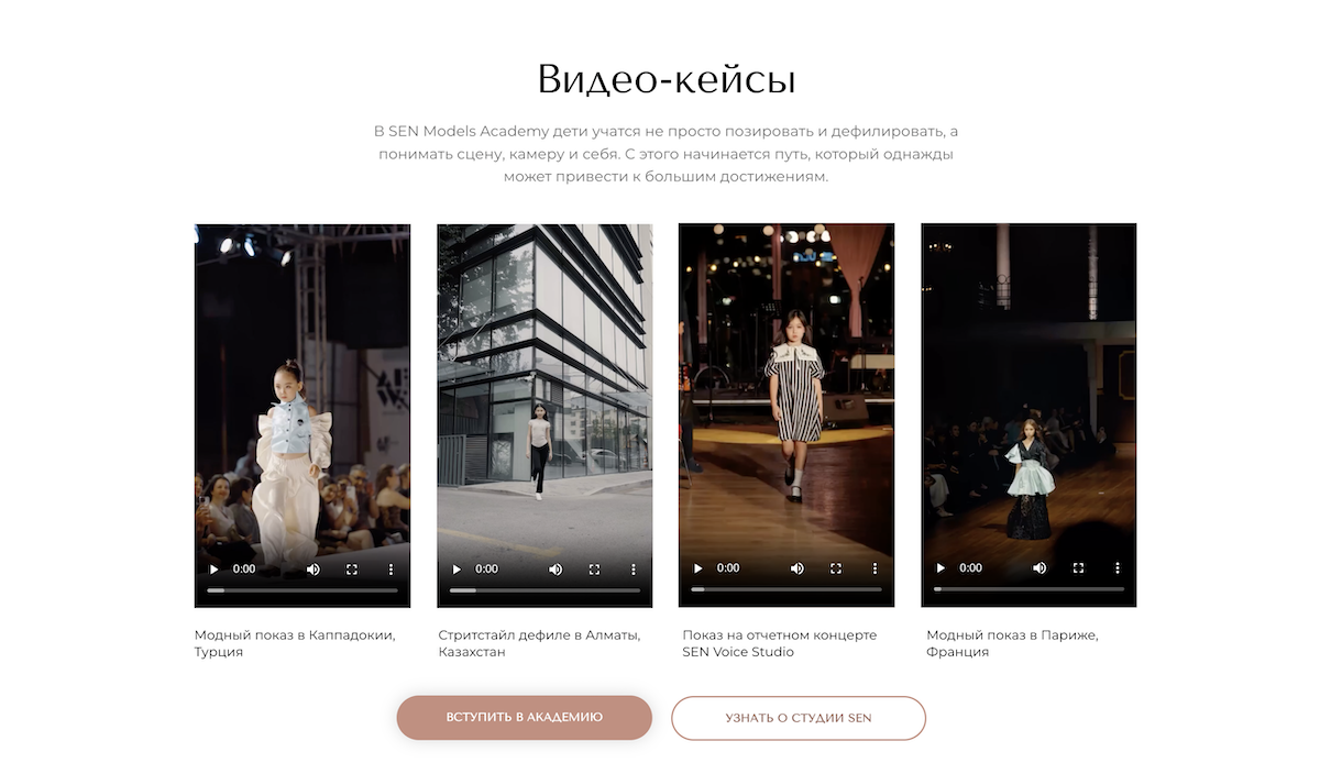 Также интегрированы видеокейсы с показов и дефиле, что усиливает вовлеченность пользователей и наглядно демонстрирует уровень подготовки моделей после прохождения обучения.